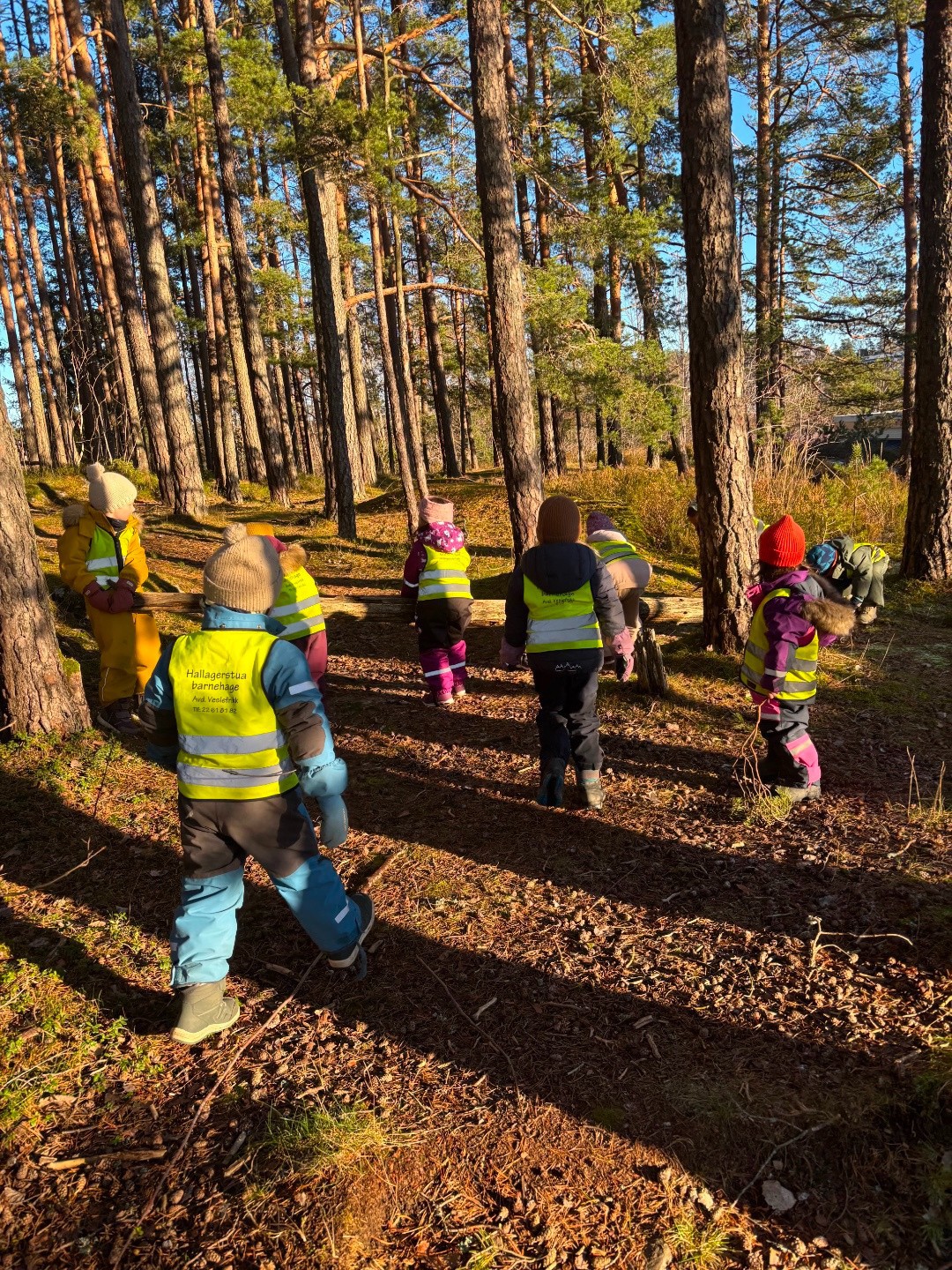 Vi bruker uteområdet vårt aktivt, og vi er ofte på tur i nærmiljøet. Naturen gir rom for rollelek, samarbeid, motoriske utfordringer og undringer, hvor vi jobber målettet mot å bli en friluftsbarnehage. For oss betyr det at vi øver oss på å være ute i allslags vær, bli tryggere på tur, og gjøre friluft en naturlig del av hverdagen.